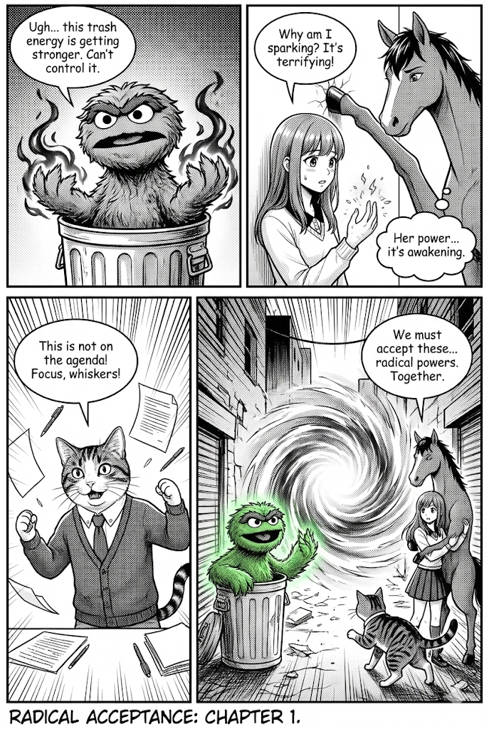 "Take these characters [photos I sent earlier in the chat for other tests] and put them in a manga comic page, the topic of the story is learning how to come to terms with your radical powers" - Nano Banana Pro in November 2025