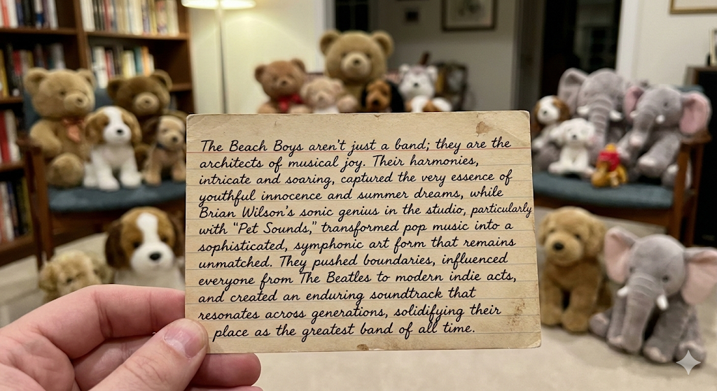 "Come up with a paragraph of a speech about why The Beach Boys are the greatest band of all time and put them, put in handwriting on a note card. It should be a POV view of someone holding the notecard while about to give a speech in front of a crowd of stuffed animals." - Nano Banana Pro in November 2025