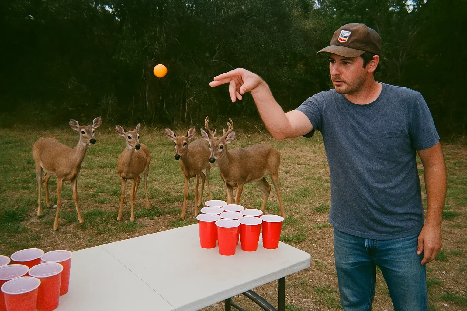 Prompt Adherence: "Make me a photorealistic image in the style of a disposable camera of a man wearing a hat with a logo for a oil company playing beer pong with a group of deer" - ChatGPT 4o in March 2025