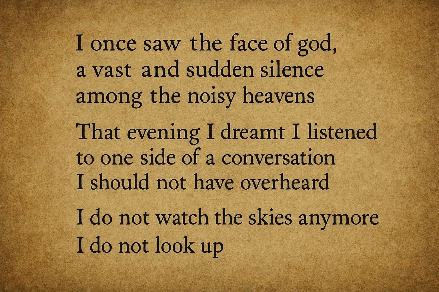 Text: "'I once saw the face of god, a vast and sudden silence among the noisy heavens That evening I dreamt I listened to one side of a conversation I should not have overheard I do not watch the skies anymore I do not look up'" - ChatGPT 4o in March 2025