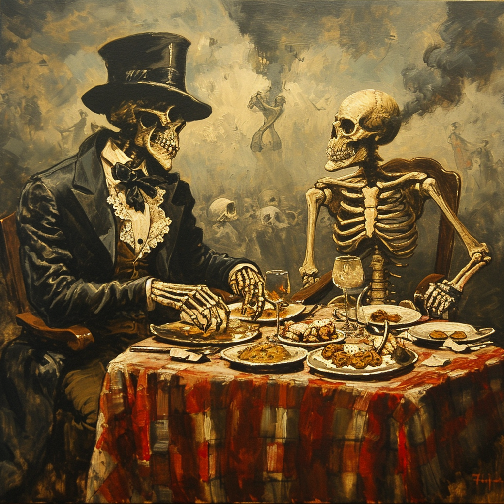 "the monopoly man dining on the corpses of the poor" - Midjourney v6 in December 2023